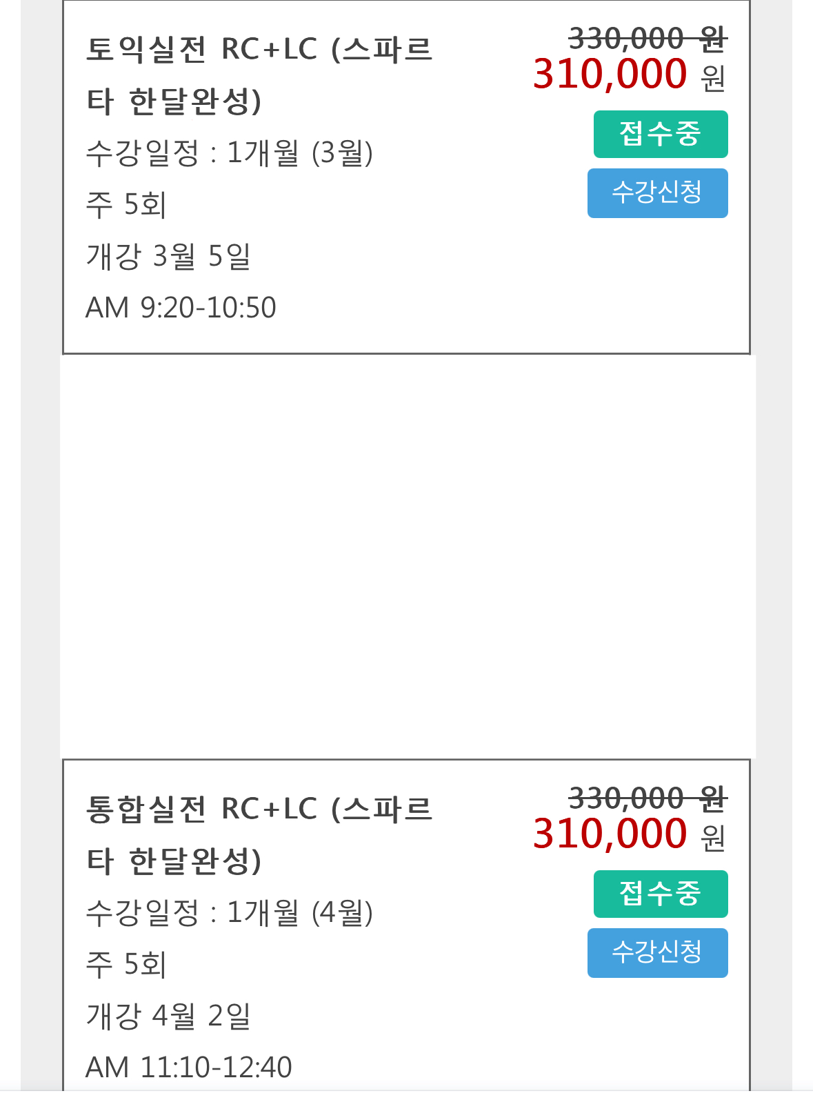 온라인 수강신청을 하려고 하는데, 실전800 RC+LC 항목에서 ‘토익실전 RC+LC (스파르타 한달완성)‘ 반과 ‘통합실전 RC+LC (스파르타 한달완성)‘ 이 어떻게 다른가요?