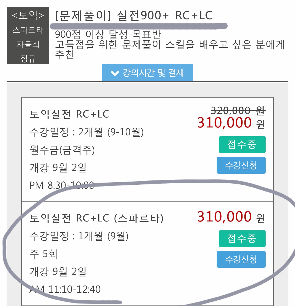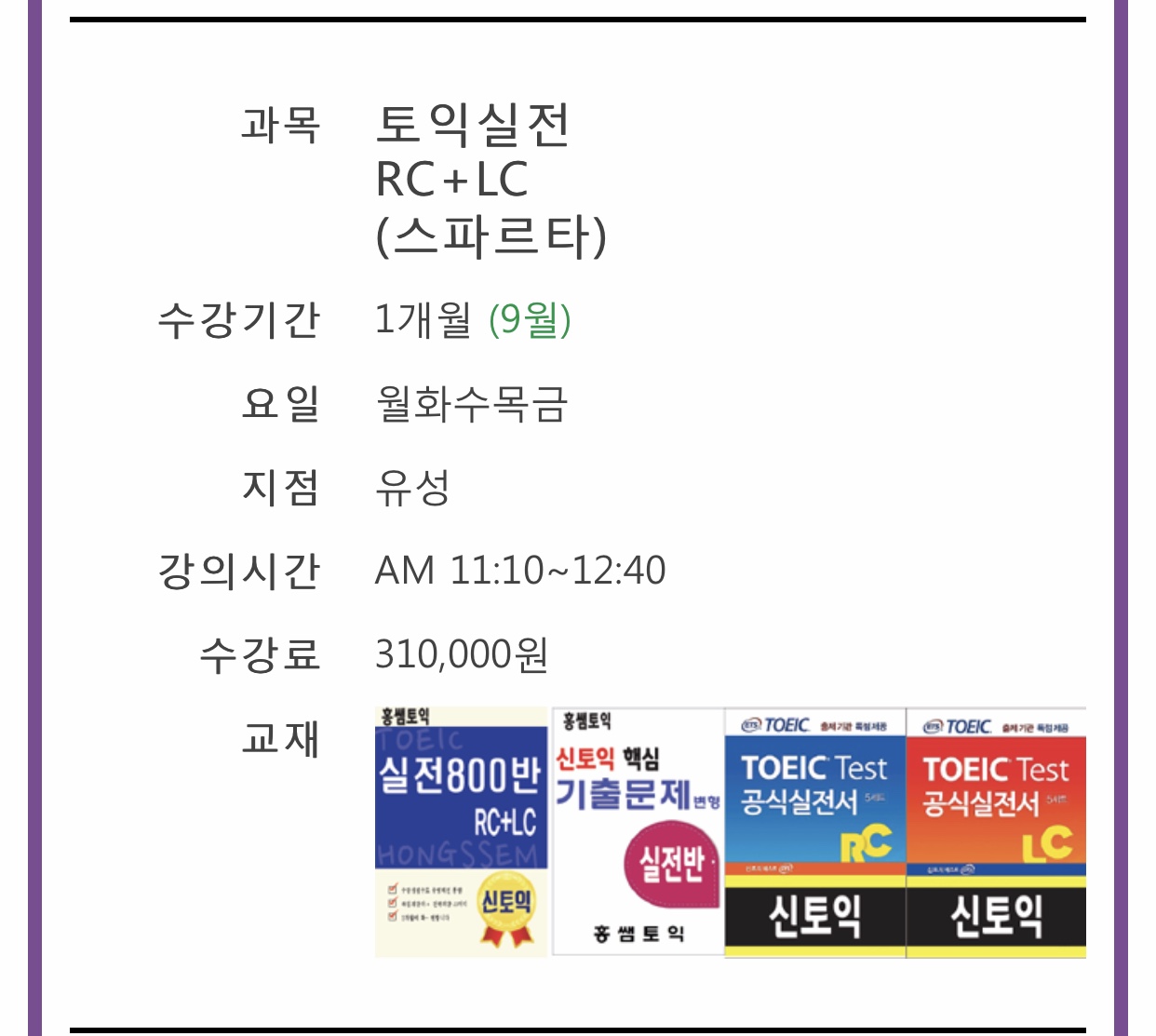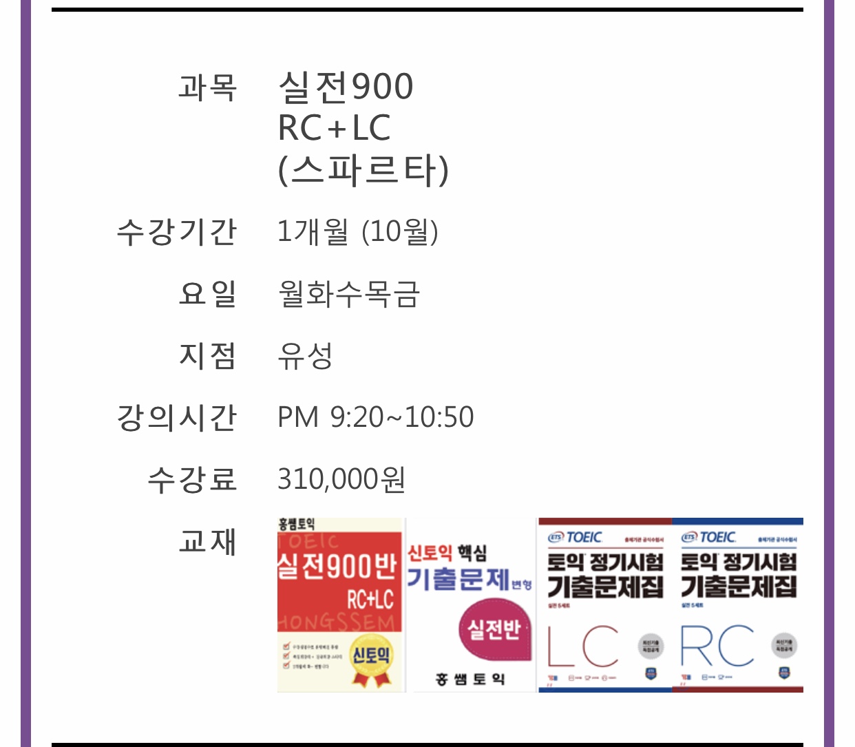 오늘자로 유성점 토익실전RC+LC(스파르타반) 9월(1개월) 온라인 신청했는데 확인 한번만 부탁드려요. 추가적으로 교재는 별도로 구매해야하는건가요? 그리고 시간표에는 10월 수업에만 900교재가 있고 온라인 수강신청 화면에는 실전900 목록에 9월반이 있던데 그럼 제가 등록한 수업에서는 800교재를 쓰는건가요? 아님 900교재를 쓰는건가요? 혹시 9월 2일 개강날 챙겨가야하는 게 있다면 알려주세요!(예를 들면 수강증 같은거요)